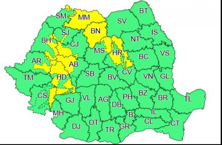Interval de valabilitate: 13 ianuarie, ora 15 – 15 ianuarie, ora 08 Fenomene vizate și zone afectate: precipitații moderate cantitativ: mixte în zonele joase de relief din vest, predominant ninsori în Maramureș și Transilvania și ninsori la munte, intensificări ale vântuluiÎn intervalul menționat aria preciptațiilor, în general moderate cantitativ, va cuprinde vestul, nord-vestul și centrul țării. În zonele de munte va ninge și se va depune strat nou de zăpadă, în Maramureș și Transilvania vor predomina ninsorile, iar în regiunile vestice se vor semnala precipitații mixte. Izolat se va produce polei.Vântul se va intensifica treptat în toate zonele de munte, cu precădere la altitudini mari, unde rafalele vor depăși temporar 70...80 km/h, viscolind ninsoarea sau spulberând zăpada. Intensificări vor fi și în restul țării, în noaptea de duminică spre luni (13/14 ianuarie) în regiunile vestice, iar pe parcursul zilei de luni (14 ianuarie), local și în cele sudice, centrale, estice și sud-estice, în general cu viteze de 45...55 km/h.Notă: Marți (15 ianuarie) și miercuri (16 ianuarie) vântul va continua să sufle tare în toate zonele de munte, spulberând zăpada și viscolind ninsoarea, dar intensificări ale vântului vor fi local și temporar și în celelalte zone.
