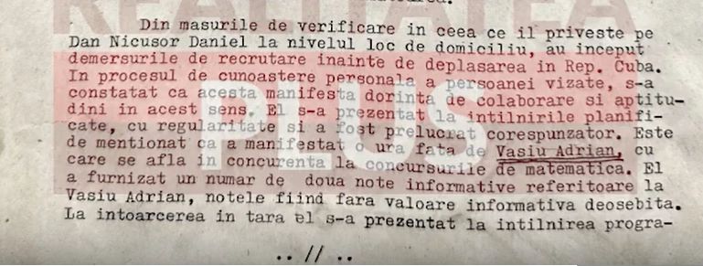 Din el, aflăm că Nicușor Dan fusese recrutat încă din 1987, înaintea olimpiadei de matematică din Cuba, că și-a turnat colegi selectați pentru olimpiada de matematică din Canberra, Australia, 1988, dar și profesorul de liceu, și că manifesta aptitudini reale de turnător, ca și voința de a lucra cu organele.