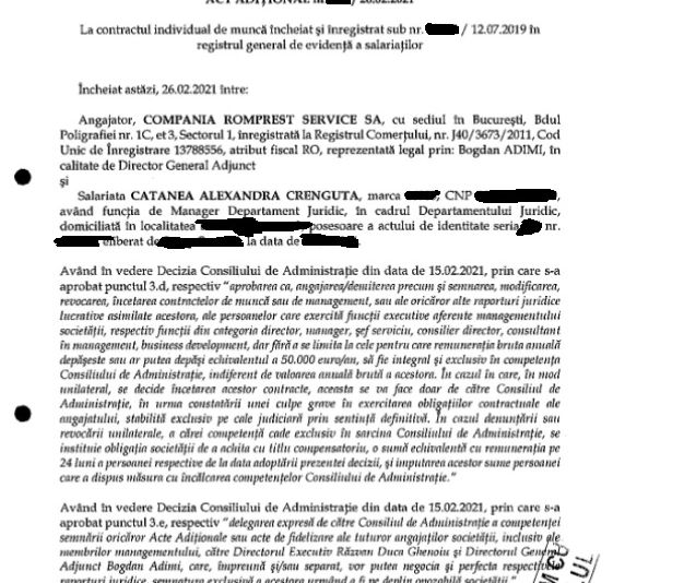 Ajunsă peste noapte director juridic în cadrul companiei de salubritate Romprest, Alexandra Crenguța Catanea a trebuit să dea o probă de aptitudini. Ce o recomanda în funcția de conducere? Numai Bogdan Adimi știe, boss-ul tomberoanelor care ar fi supus-o la mai multe testări, scrie realitateadinmoldova.md.