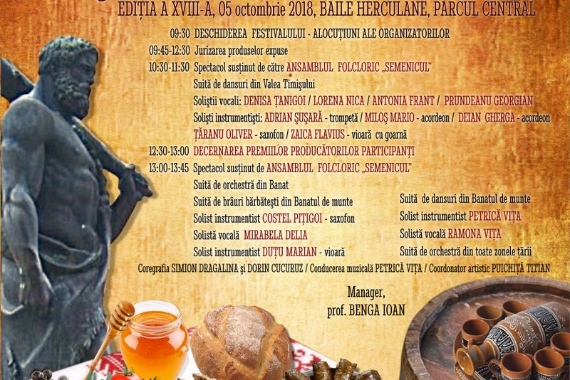 Consiliul Județean Caraș-Severin prin Centrul Județean pentru Conservarea și Promovarea Culturii Tradiționale Caraș-Severin (CJCPCT CS) și autoritățile locale din Băile Herculane dau pe 5 octombrie startul Festivalului Răchei și Bucatelor Tradiționale.Ajuns la a XVIII-a ediție acesta s-a impus ca un festival tradițional al stațiunii deși, la mofturile echipei lui Frunzăverde, au fost și câteva ediții desfășurate în altă parte, inițial fiind un festival stric al răchei, ulterior, în ultimele ediții adăugând și bucatele tradiționale.Manifestarea va avea loc în Parcul Central din Băile Herculane vineri, 5 octombrie 2015.
