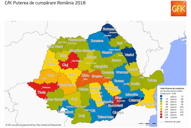 Harta GfK Putere cumparare_Romania 2018Județele situate aproape de nivelul mediei pe țară din punctul de vedere al puterii de cumpărare sunt acelea care includ orașe aflate în competiția dezvoltării: