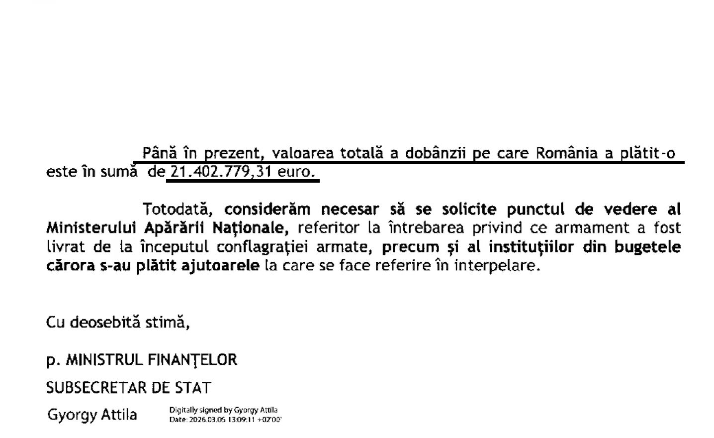 Într-un răspuns oficial al Ministerului Finanțelor la interpelarea unui parlamentar, se precizează că suma pe care România a achitat-o pentru dobânzile la împrumuturile obținute de Ucraina este de 21,4 milioane de euro, dar suma totală pe care o are de achitat este aproximativ dublă. "În anul 2023, Uniunea Europeană a adoptat Regulamentul (UE) 2022/2463 privind instituirea unui instrument de asistență macro‑financiară pentru Ucraina. Prin acest regulament, Comisia Europeană a fost autorizată să acorde Ucrainei un împrumut în valoare de 18 miliarde euro, statele membre contribuind prin subvenționarea ratei dobânzii.