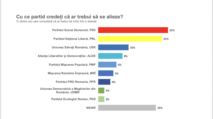 28% dintre români ar accepta şi ideea unei alianțe politice sau electorale pentru Partidul Realitatea. Primele trei opțiuni sunt: PSD cu un procent de 23%, urmat la diferență de două procente de PNL. 10% au plasat USR pe locul trei. Urmează ALDE 8%, PMP 6%, MRI 5%, Pro Romania 4%, UDMR şi Partidul Ecologist, câte 2%.