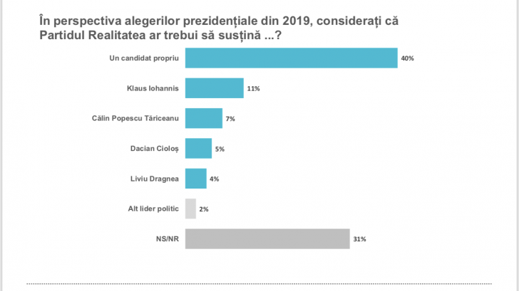 40% dintre participanții la sondajul CURS consideră că Partidul Realitatea trebuie să aibă un candidat propriu la prezidenţiale. Datele mai arată că 11% vin cu alternativa de a-l susține pe Klaus Iohannis pentru un nou mandat, în timp ce 7% optează pentru sprijinirea lui Călin Popescu Tăriceanu și doar 5% pentru Dacian Cioloș. Totodată, 4% au răspuns că ar trebui suport pentru Liviu Dragnea, 2% pentru alt lider politic şi 31% nu ştiu sau nu răspund.