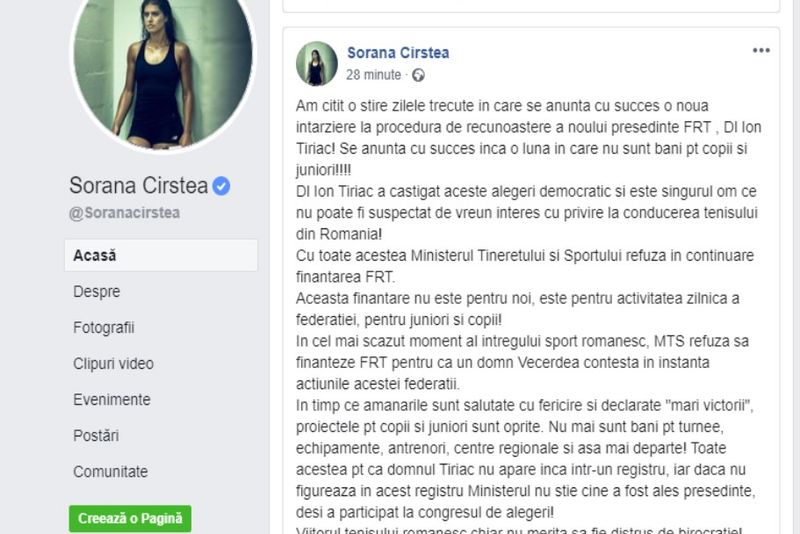 Într-o postare pe Facebook, fostul număr 1 mondial scrie: „Noi știm că aceste alegeri au fost democratice și avem convingerea fermă că, la ora actuală, Ion Țiriac este singurul om care nu poate fi suspectat de vreun interes cu privire la conducerea tenisului din România”.Pe de altă parte, Simona Halep critică și decizia Ministerului Tineretului și Sportului de a nu mai finanța federația de profil: „În timpul în care amânările sunt declarate "mari victorii", proiectele mari pentru copii și juniori sunt oprite pe loc, pentru că statul refuză să le finanțeze”.„Din poziția noastră de promotori ai sportului românesc și ai României, solicităm responsabilitate din partea Ministerului, respectiv reluarea în regim de urgență a finanțării Federației și a programelor sale”, mai spune Simona Halep.